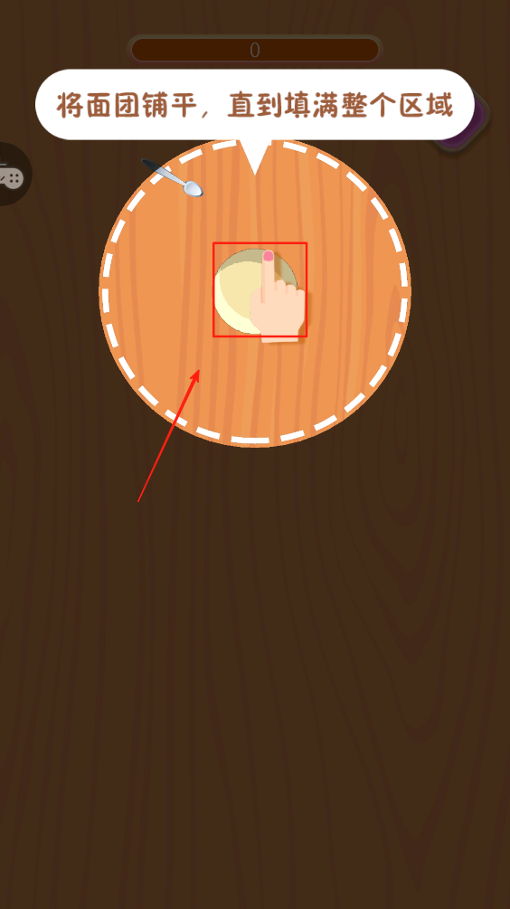 4、根据提示,将面团铺平填满整个区域,完成披萨制作步骤。