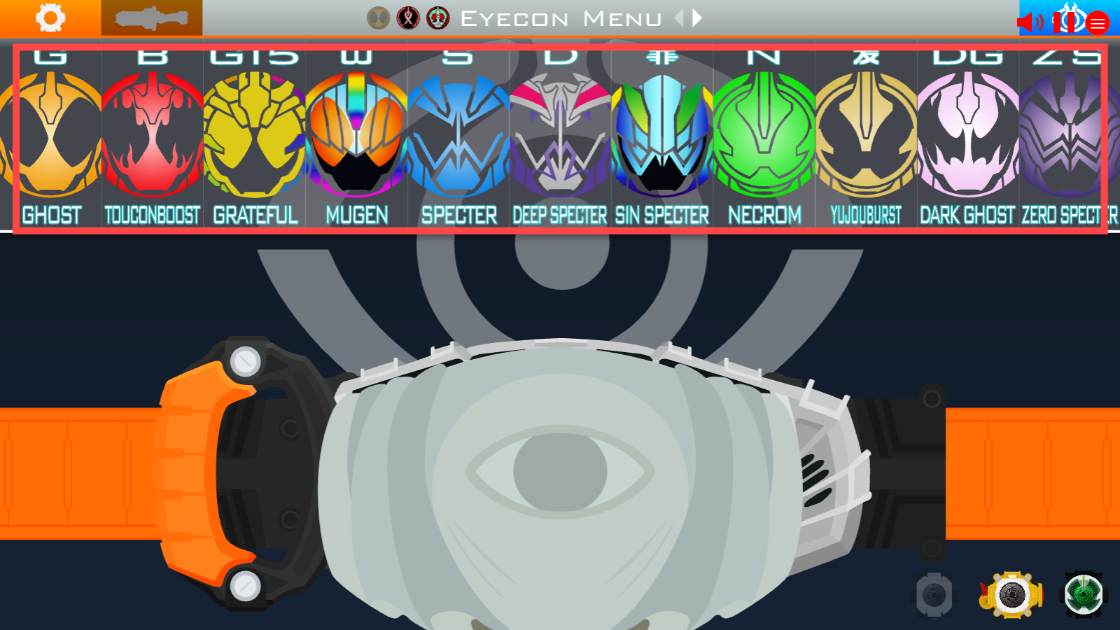 2、在【EYECONMENU】界面浏览各类眼魂,点击选择心仪的眼魂,体验不同变身音效与形态。