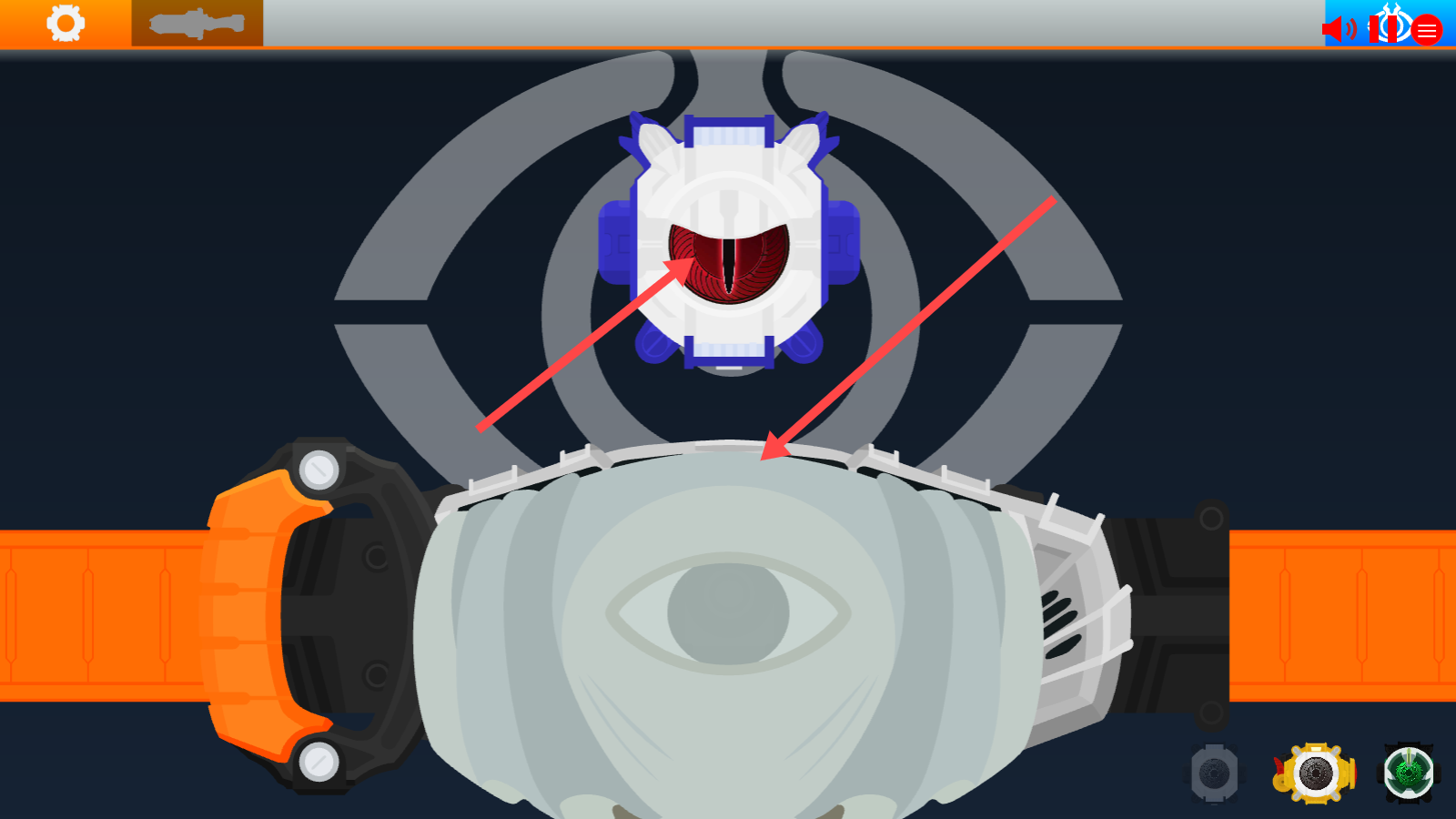 3、按图中箭头指示,将选中的眼魂放入腰带对应位置,完成操作触发变身效果,感受假面骑士魅力。