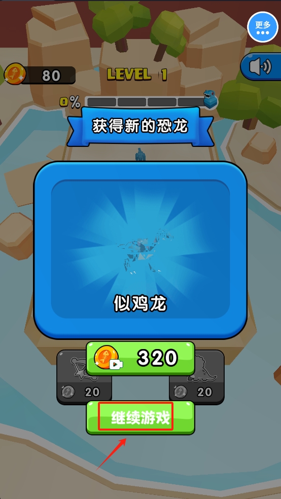 3、点击“继续游戏”按钮,确认购买新的恐龙并开始新一轮的游戏挑战。