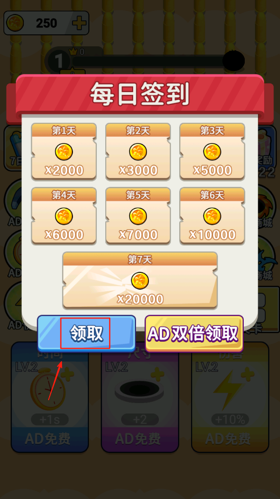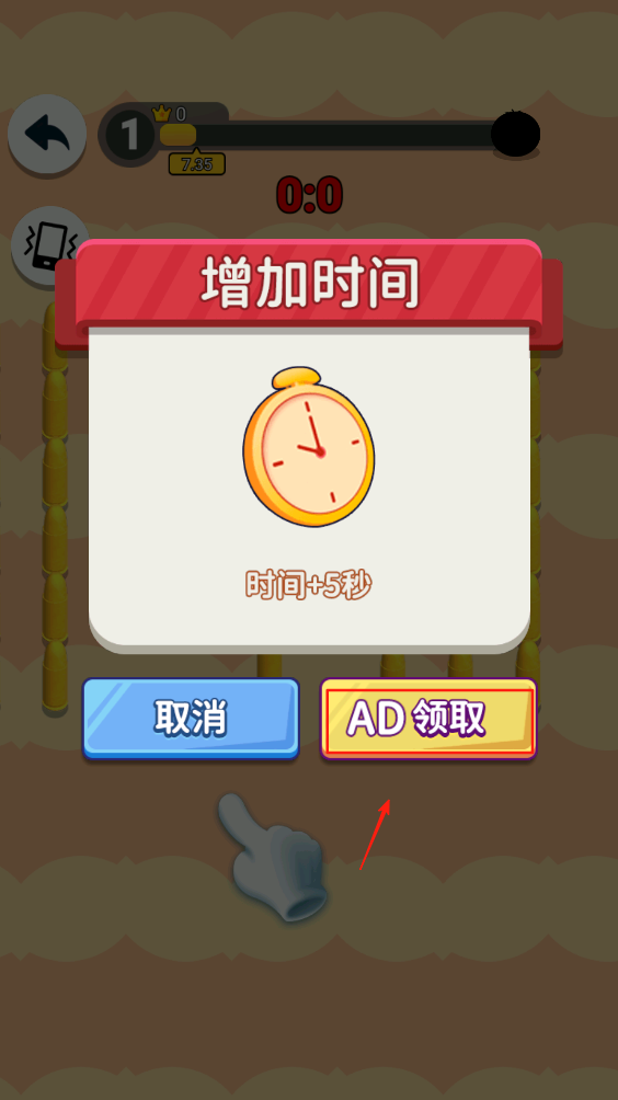 4、 时间不够时,点 “AD 领取” 看广告增加 5 秒时间。