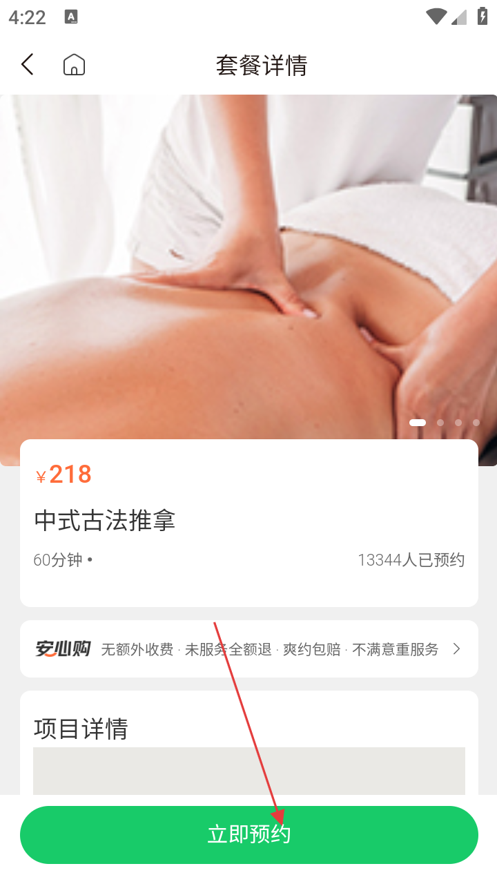 3、服务项目丰富:提供推拿按摩等多种理疗项目,分类清晰便于选择,满足用户不同身体状况与健康调理需求。