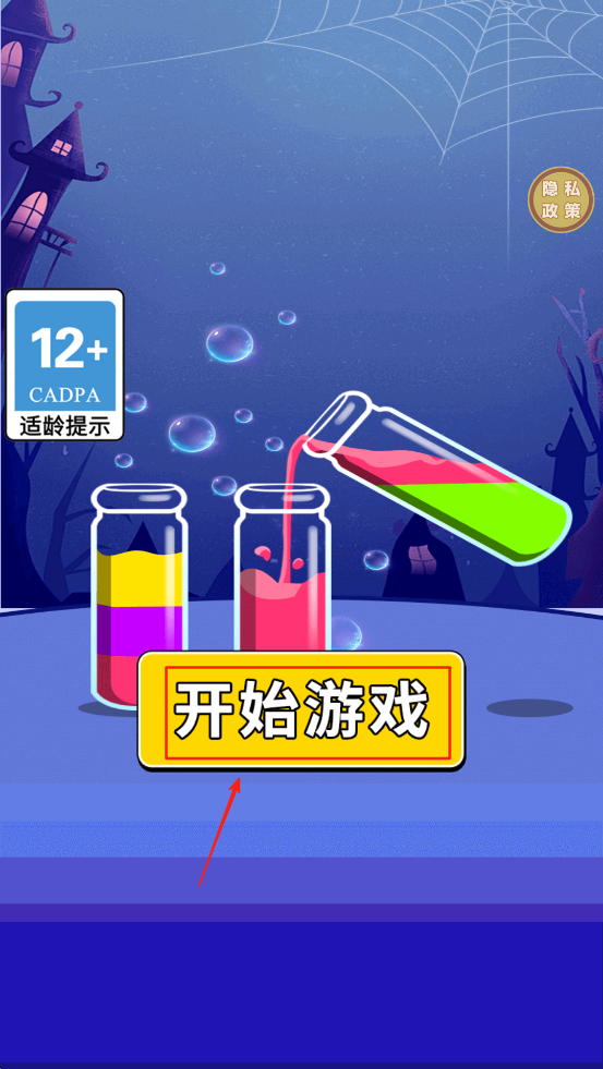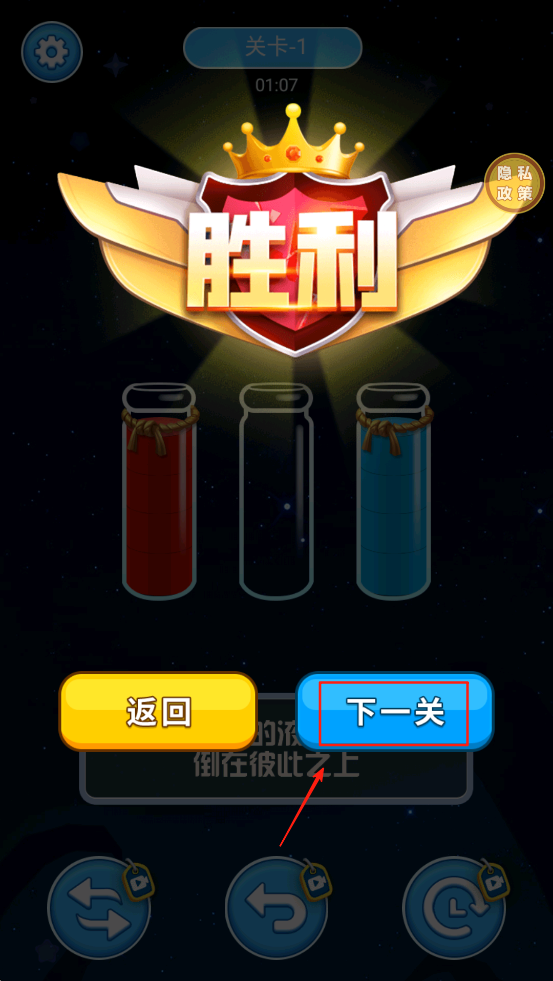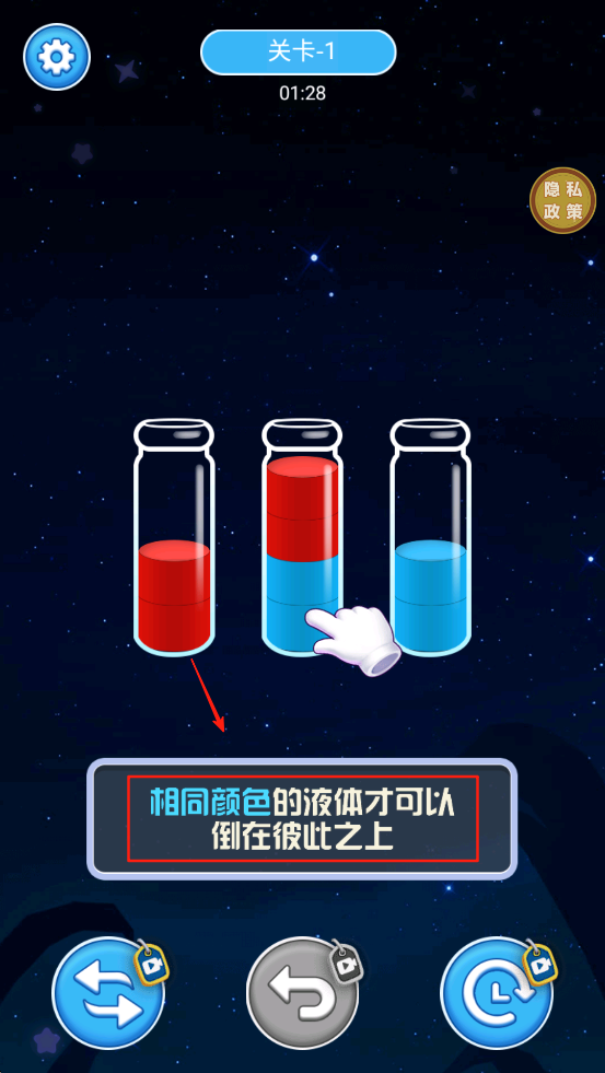 2、在关卡界面,按照提示将相同颜色的液体倒入对应颜色的试管中。