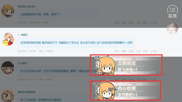 3、点击【立即回怼】获得1放飞自我属性值,选择【内心吐槽】获得1岁月静好属性值。