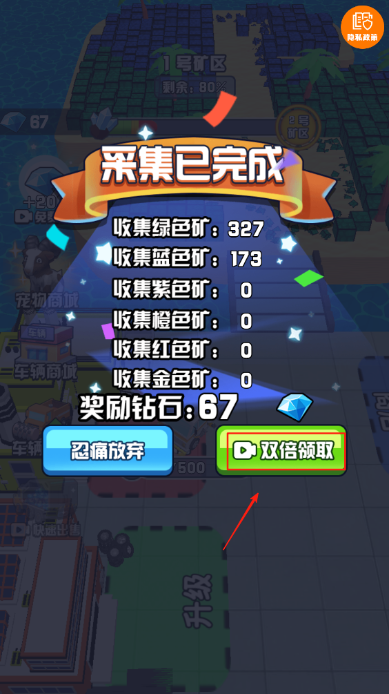 3、在完成矿石采集后,点击“双倍领取”按钮,获取双倍的奖励钻石。