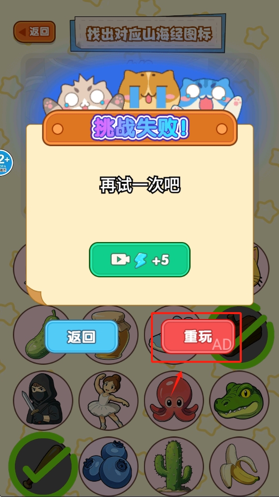 4、如果挑战失败,可以选择重玩,重新挑战游戏。