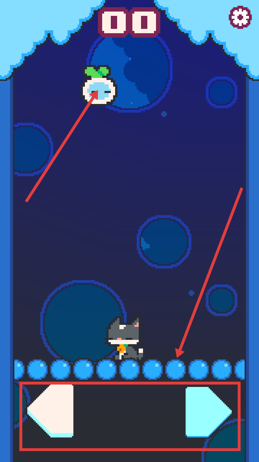 1、通过屏幕下方左右按钮控制角色移动,尝试躲避上方类似【萝卜】的怪物。