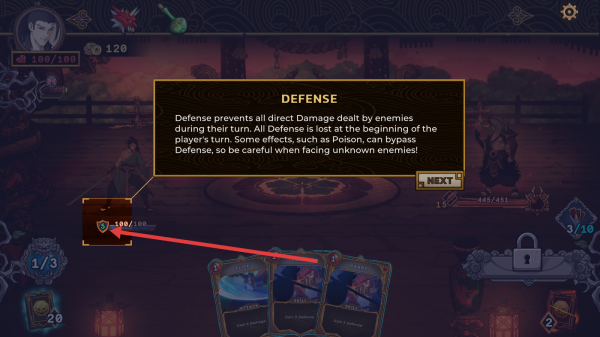 3、理解【“Defense”】机制,防御可防止敌人回合的直接伤害,且玩家回合开始时防御值清零,面对敌人时注意毒药等可绕过防御的效果。
