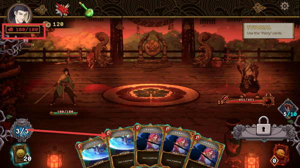 1、新手教程提示使用【“Parry”cards】,战斗中可适时打出该类卡牌获取防御值抵御敌人攻击,在左上角关注自己的血量。