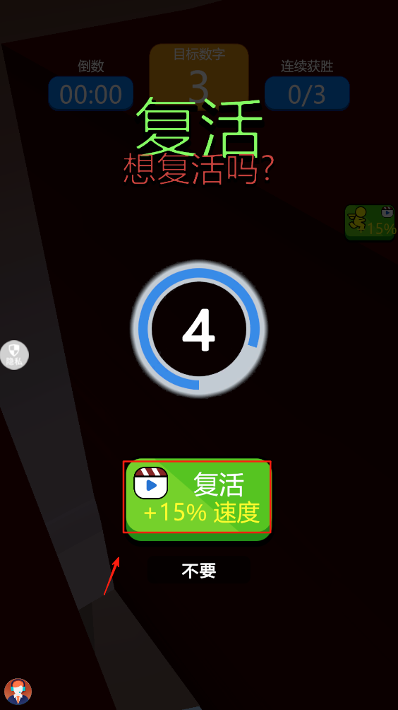 4、游戏失败后,选择是否观看广告复活并加速。