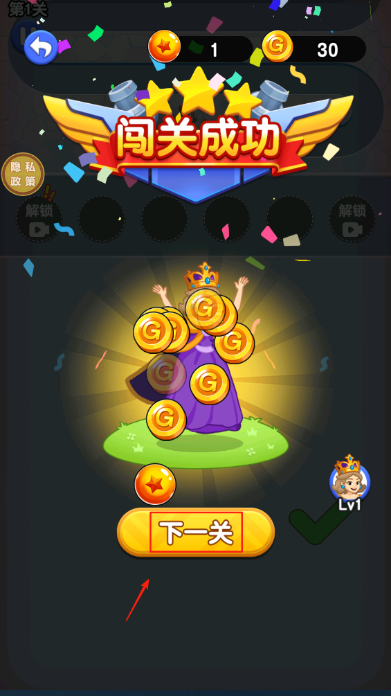 4、成功过关后,点击“下一关”继续挑战,或查看你的奖励和成就。