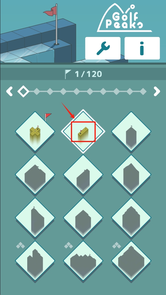 2、在关卡界面,通过点击旗杆和球体,选择关卡和击球目标位置。