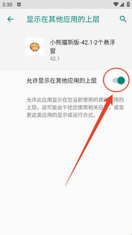 2、打开“允许显示在其他应用的上层”,这样就能开启悬浮窗,方便游戏的时候打开悬浮窗操作。