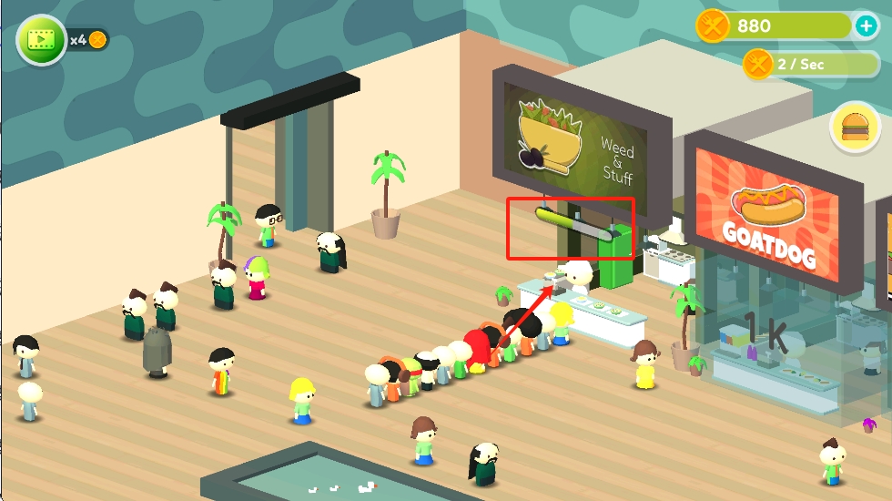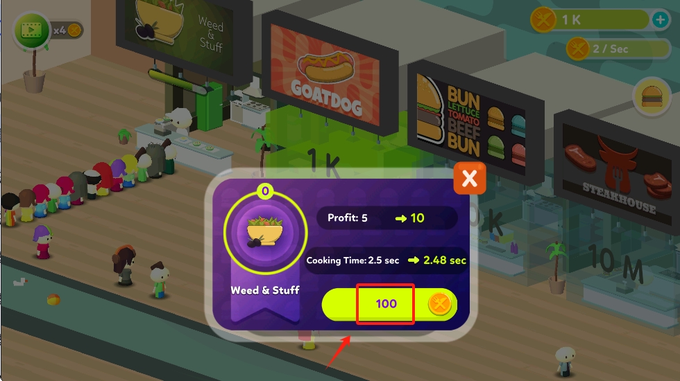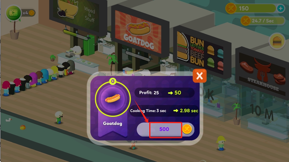 4、点击“500”按钮购买并升级“Goatdog”摊位,提高你的收入。