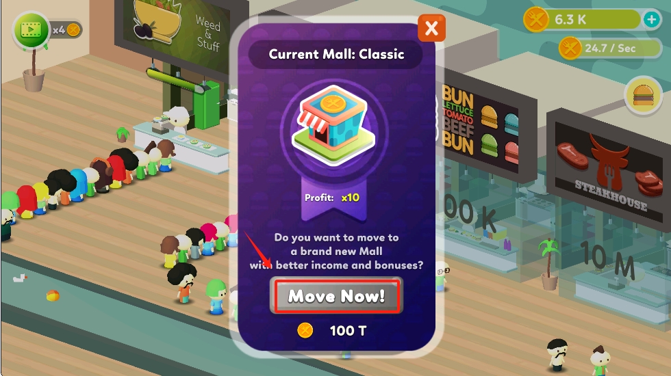 2、点击“Move Now”按钮升级你的广场,获得更高的利润和奖励。
