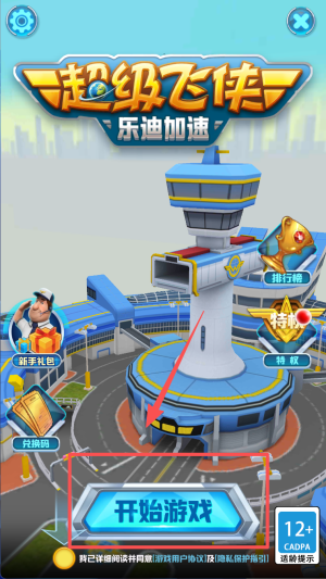 4、超级飞侠乐迪加速进入主界面后先领取新手礼包,再查看特权与排行榜,输入兑换码后点“开始游戏”即可正式起飞。