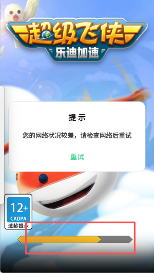 3、超级飞侠乐迪加速若提示网络状况差,请先确认Wi-Fi或数据已开启并信号良好,然后点击“重试”重新连接服务器。