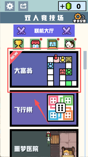 2、进入双人竞技场大厅后可选择“联机大厅”或“更多设置”,点击“大富翁”图标准备开始游戏。