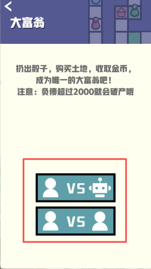 3、在大富翁模式中通过扔骰子移动角色,购买土地并收取金币,小心负债超过2000会破产。