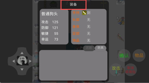 4、进入装备页将普通狗头设为手持武器确认攻击125防御121后点击“确认”保存配置即可开战。