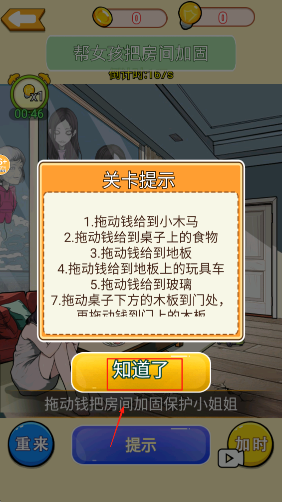 4、在游戏进行中,根据提示拖动钱把房间加固,保护小姐姐,完成关卡目标。