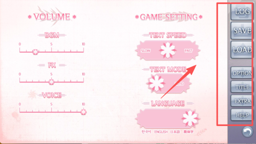 2、进入设置将TEXT SPEED调至FAST,VOICE与BGM按喜好开关再点TITLE返回。