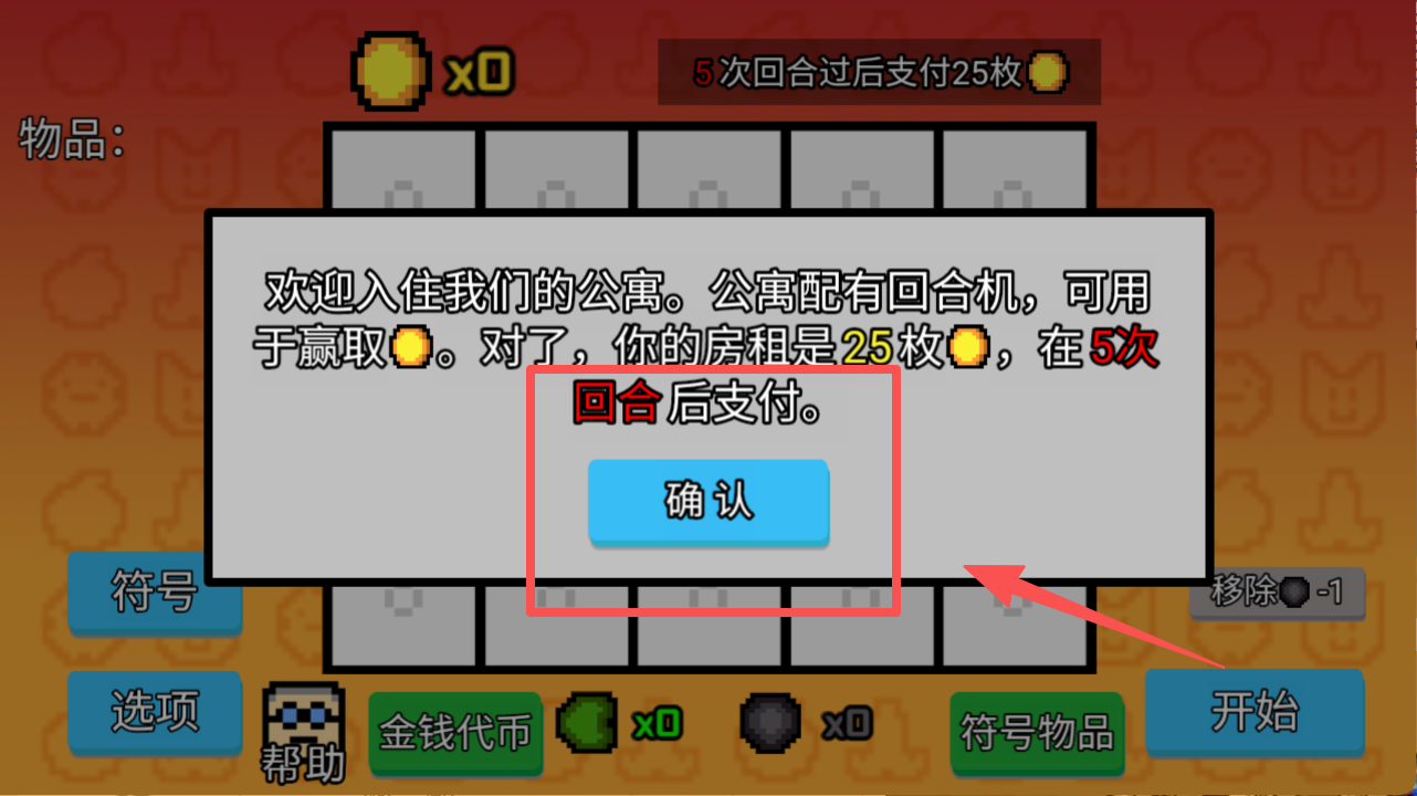 1、阅读欢迎信息确认5回合后付25枚点击开始领取初始金钱代币并熟悉面板。