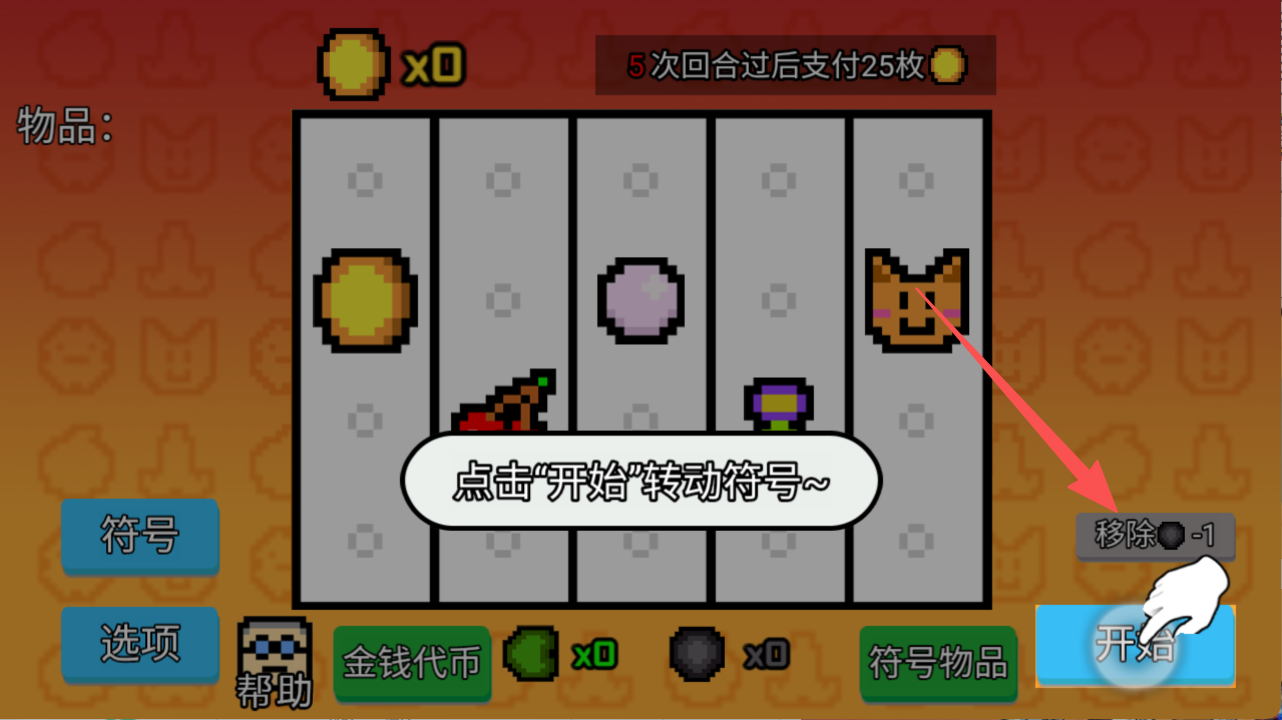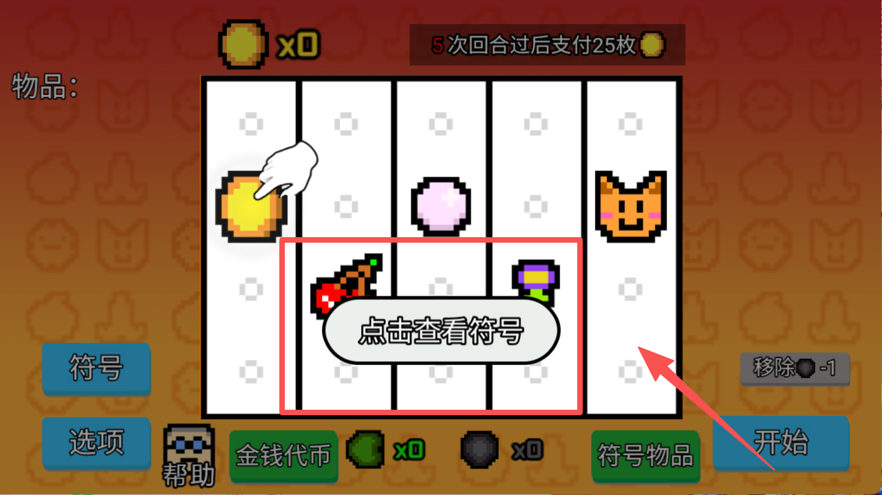 2、点击查看符号了解图案与道具功能再点开始让回合机转动收集资源。