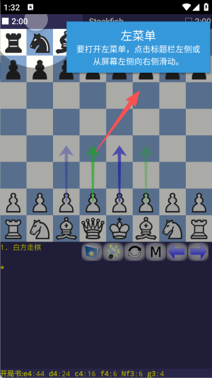 1、启动国际象棋后点击左上角图标或左滑屏幕即可展开左菜单浏览功能。