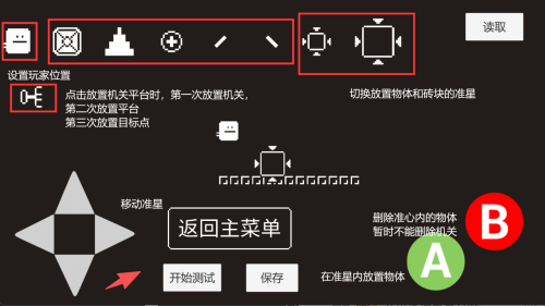 4、完成布局后点“保存”再按“开始测试”实时试玩若需删除按B清物体返回主菜单。