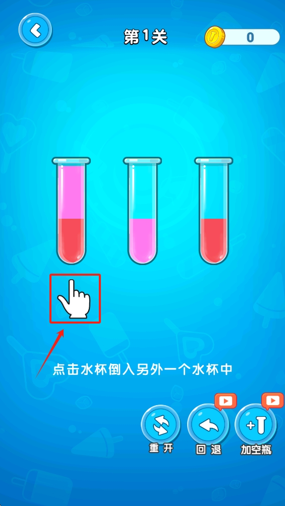 2、点击并拖动水杯,将水倒入另一个水杯中,完成关卡目标。