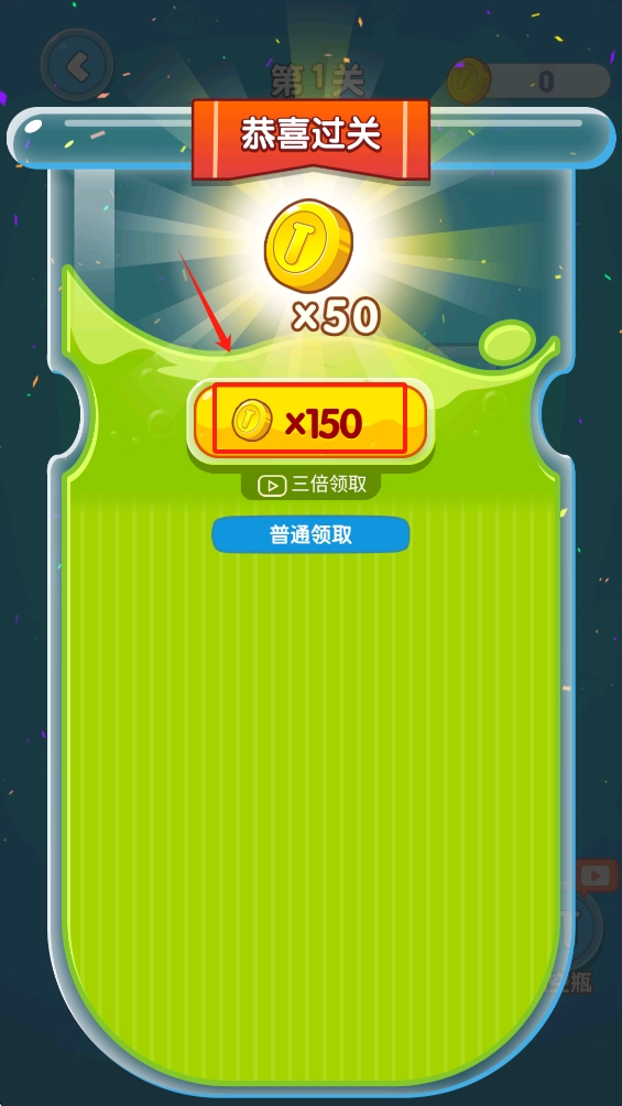 3、成功过关后,点击“普通领取”按钮,获取奖励金币,继续下一关。