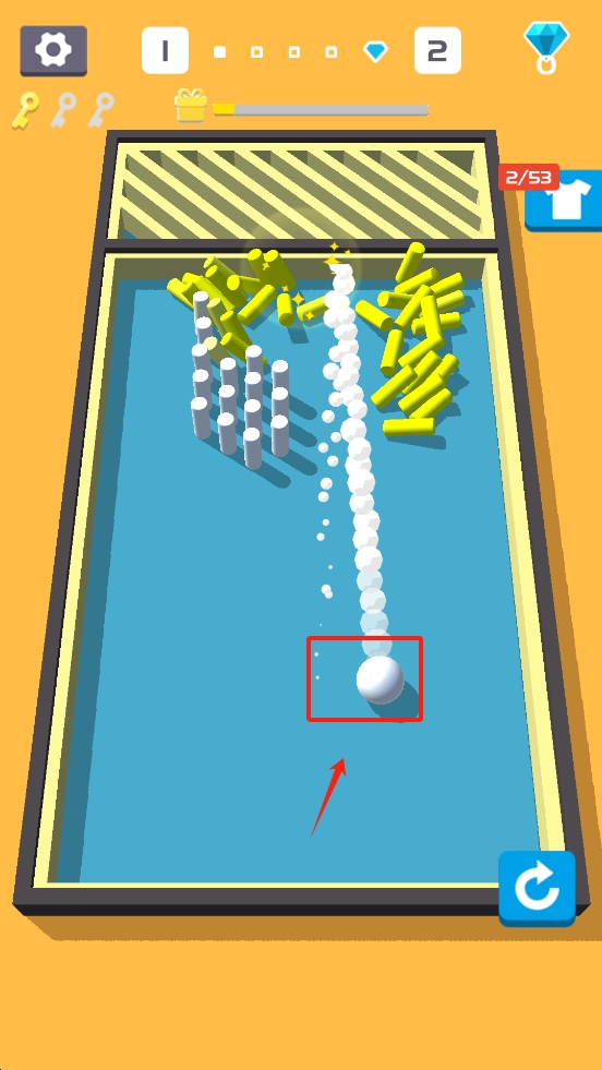 2、向后拖动调整发射小球,松开手指,小球即沿预定轨迹高速弹出。