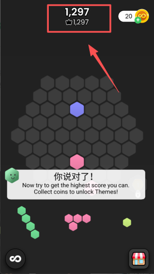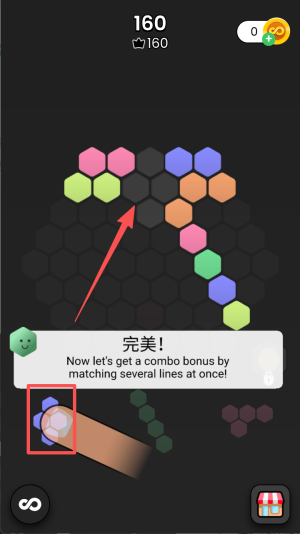 2、连线消除策略:当六边形块组成完整连线时自动消除,规划放置顺序,争取实现多次连续消除。