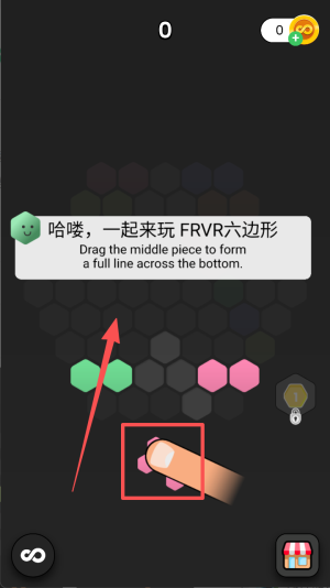 1、进入 FRVR 六边形游戏,按提示拖动中间板块,在底部形成完整一行。