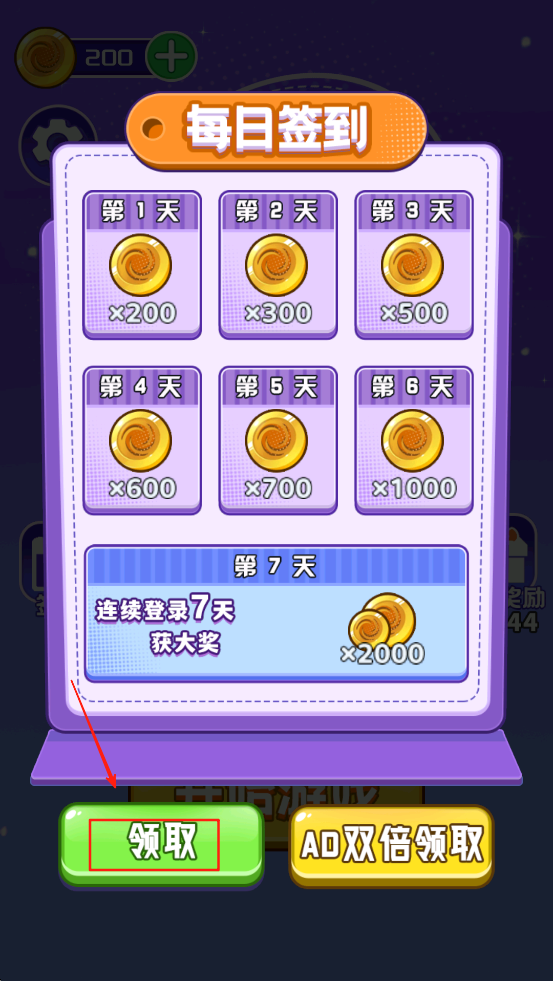 2、每日签到领取奖励,连续七天还有额外大奖,获取你的每日金币奖。