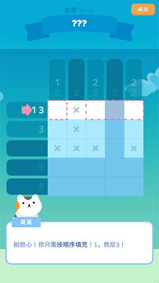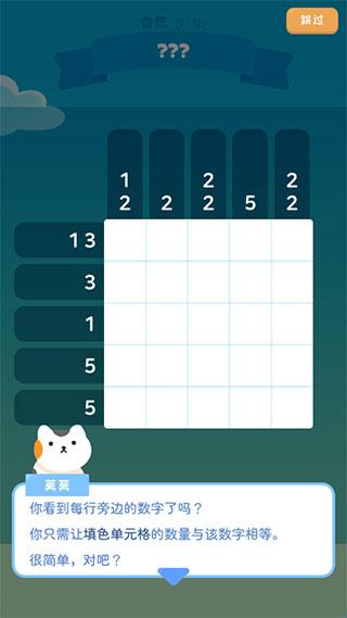 2、新手初级关卡是5x5的表格,每一行、列都有对应数字,只需让填色单元格的数量与该数字一致即可。