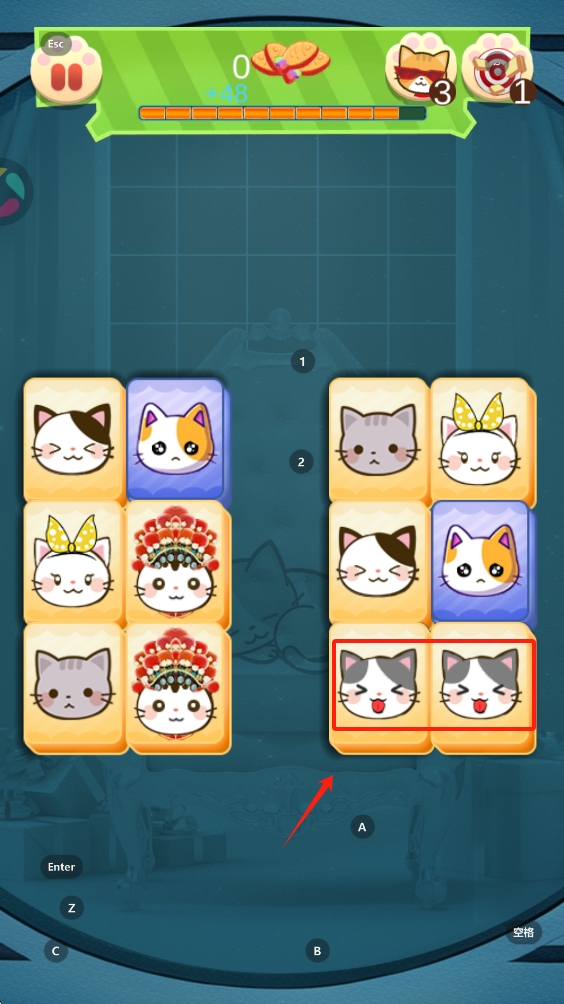 3、在游戏界面,点击右下角的相同猫图案方块,消除它们并完成关卡。