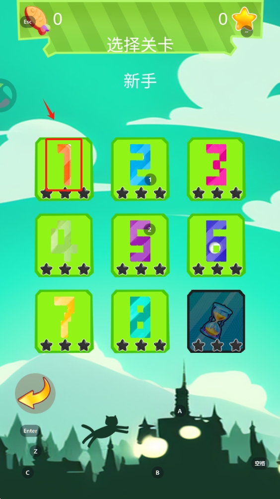 2、在关卡选择界面,点击左上角的“1”号关卡,开始新手关卡。