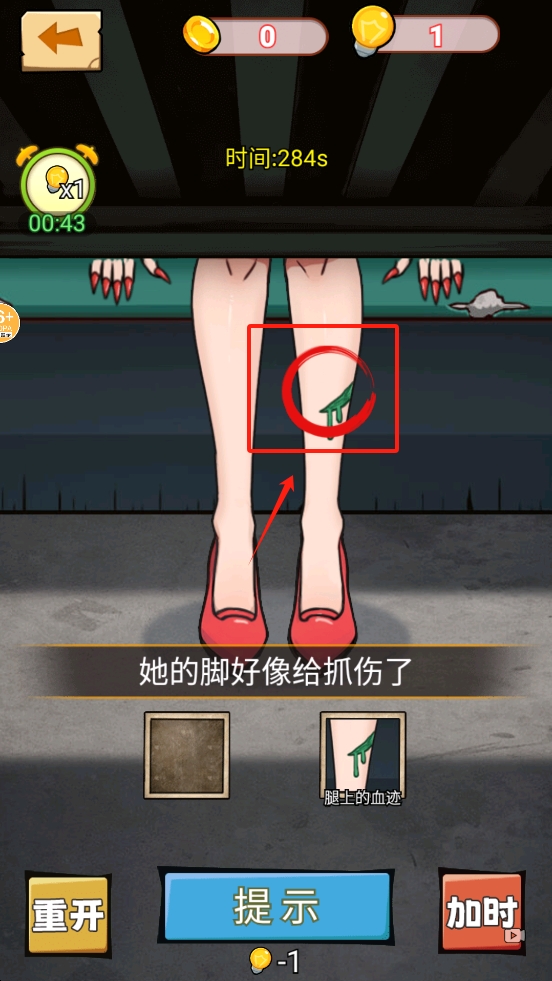 3、仔细观察画面中的细节,如血迹和物品,找到线索。