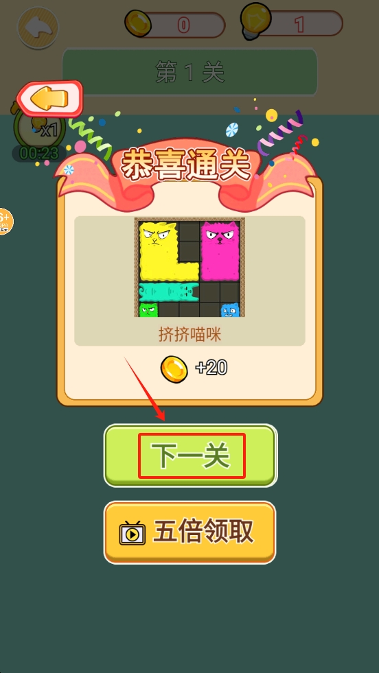 4、成功通关后,点击“下一关”继续游戏获取奖励。