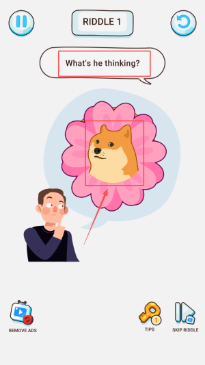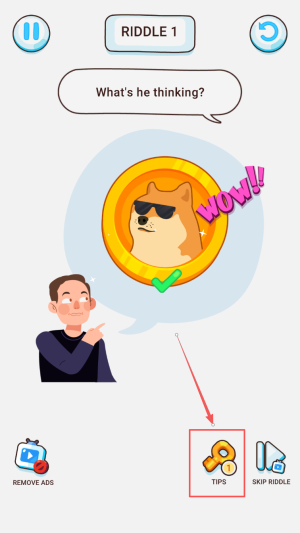 2、接着,观察题目“What's he thinking?”并点击“TIPS”获取提示。