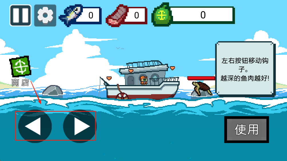 3、使用左右按钮移动钩子,根据提示,越深的鱼肉越好。