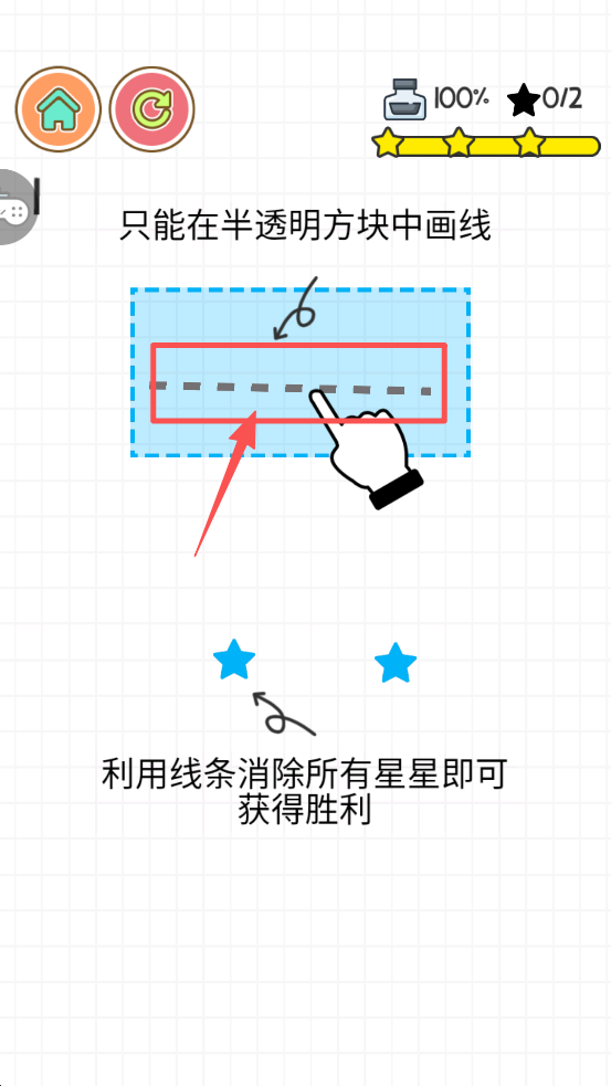 4、进行游戏操作,按照指示在半透明方块中画线,消除星星完成关卡。
