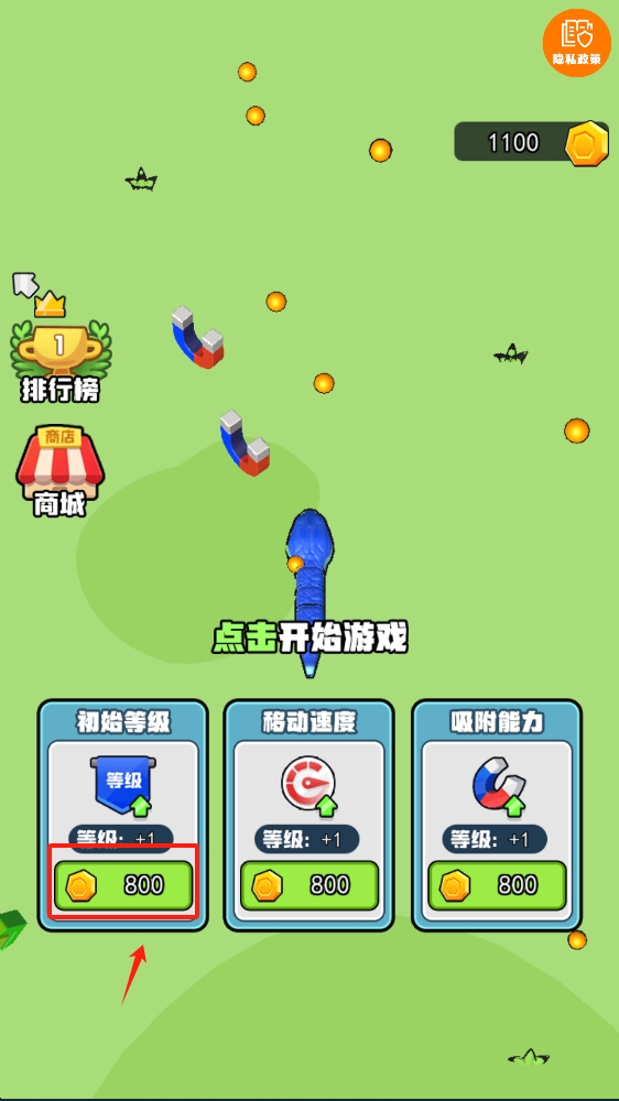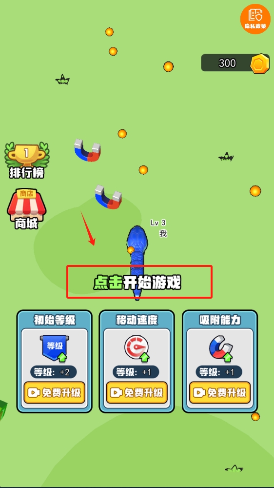 2、在点击“开始游戏”前,可以选择提升初始等级、移动速度或吸附能力。