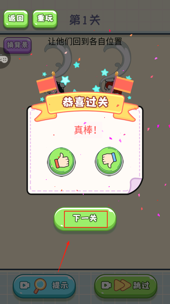 3、通过拖动角色到正确位置,完成关卡目标,点击“下一关”按钮进入下一关。