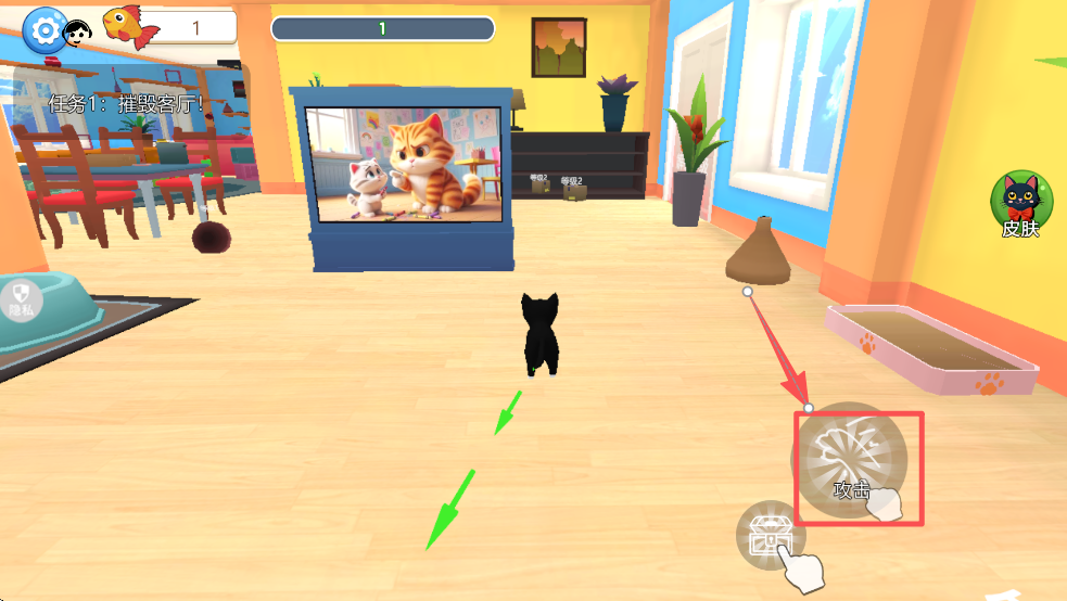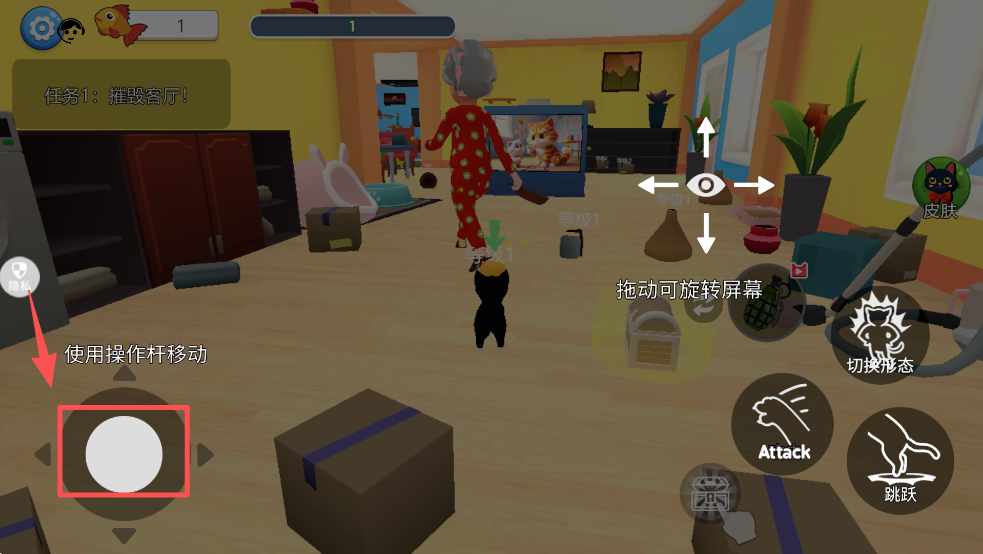 1、使用虚拟摇杆移动角色,探索房间,寻找可破坏的物品。