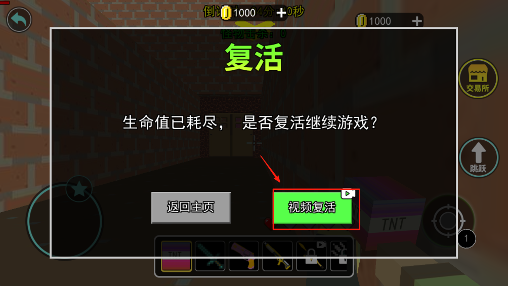4、生命值耗尽后,可以选择“视频复活”继续游戏,点击绿色按钮观看视频后复活。
