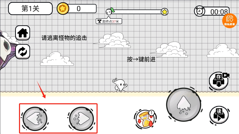 4、通过点击虚拟按键控制角色移动,躲避怪物追击,完成关卡目标。