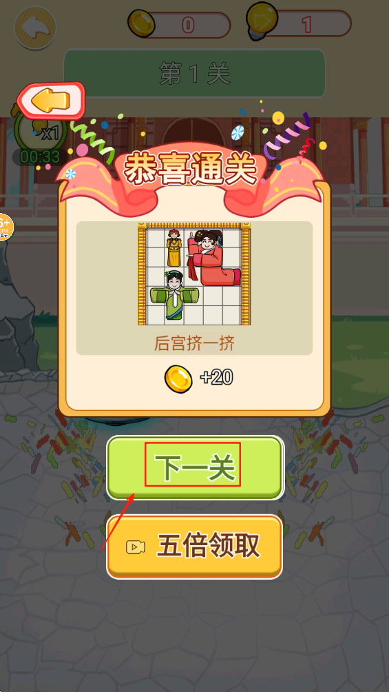 4、点击“五倍领取”按钮,获取更多奖励,然后点击“下一关”继续游戏。
